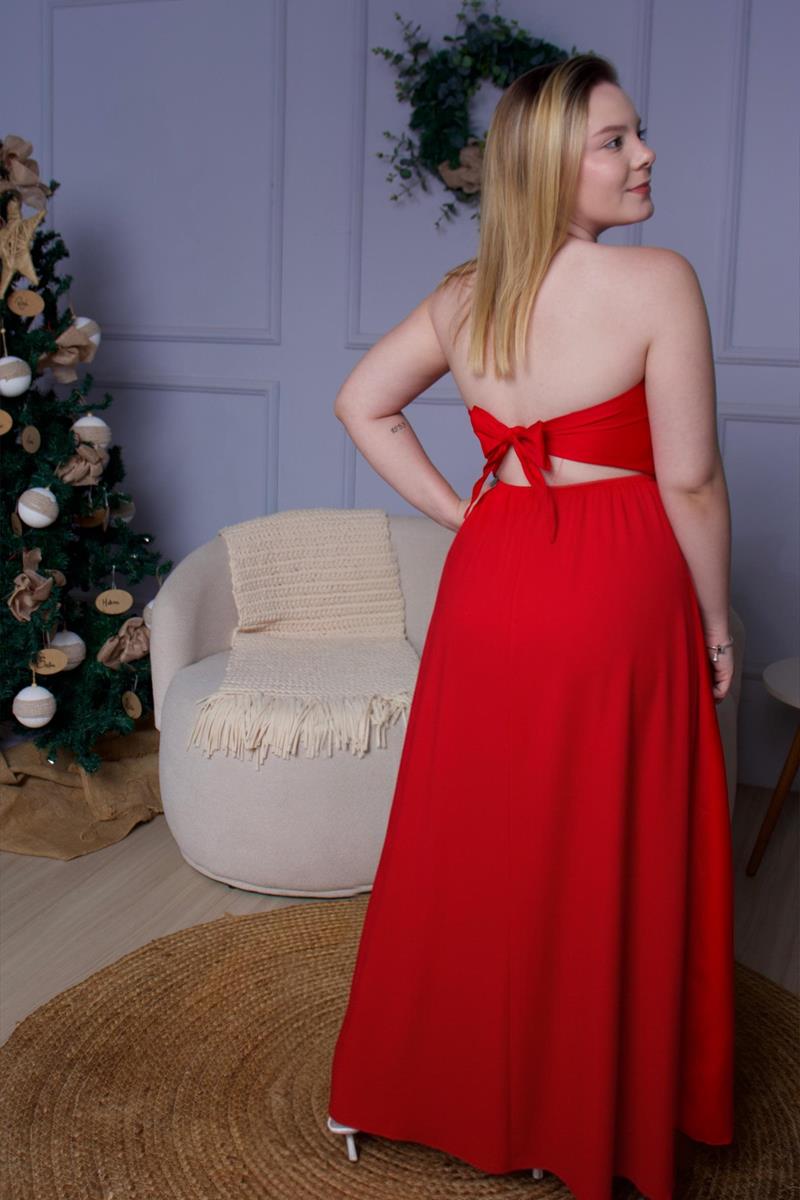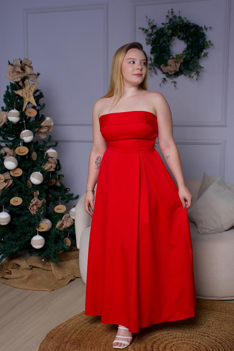 VESTIDO ALFAIATARIA, TOMARA QUE CAIA, COM AMARAÇÃO ATRÁS.